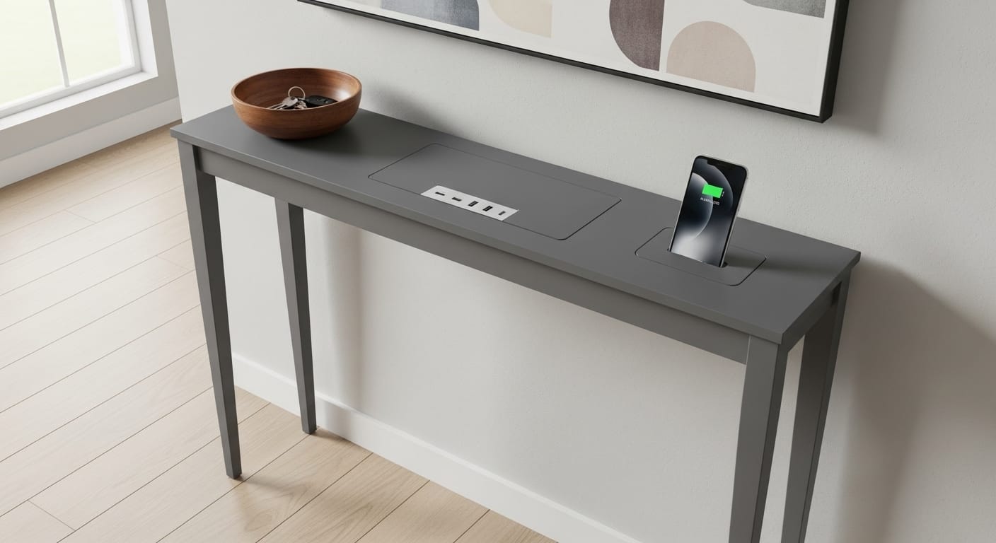 A slim console with integrated charging ports eliminates cord clutter. Perfect near entryways or bedside tables, it keeps smartphones, tablets, and other gadgets charged and organized.