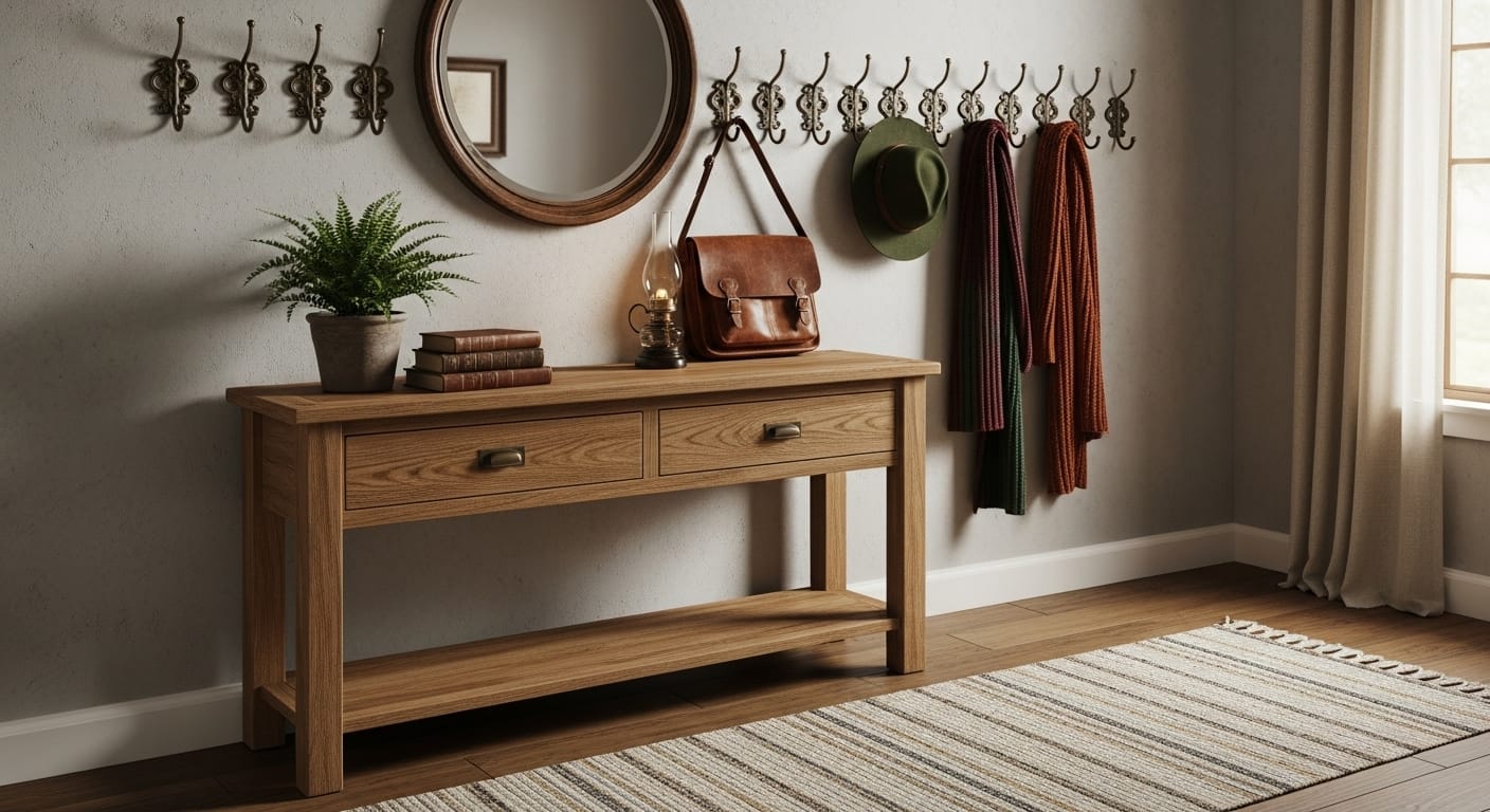 Vintage-inspired consoles combine charm with functionality. Decorative hooks hold scarves, bags, or umbrellas while maintaining a curated look.