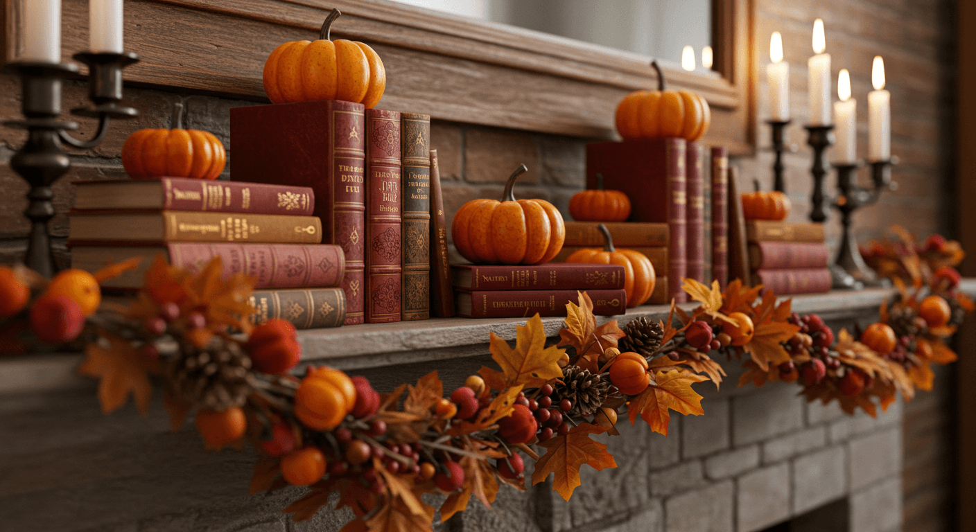 Imagine a stack of leather-bound books on one side of the mantle, topped with a glowing candle. Across the center, a few scattered novels peek out from beneath golden leaf garland, while a “cozy up with a book” sign leans casually in the background. The whole look feels like a reading nook framed by fall.