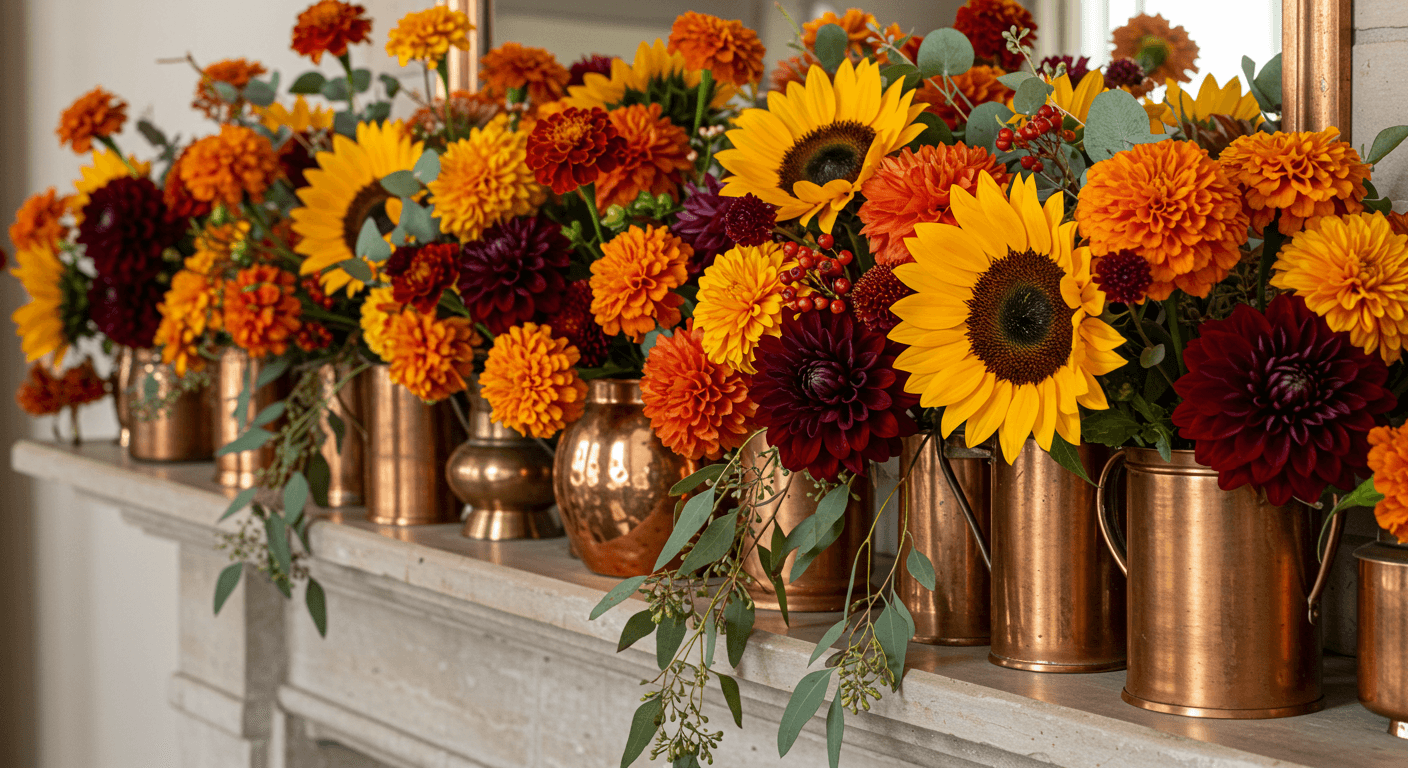 Picture a mantle with oversized sunflower heads beaming from a tall vase, their golden petals glowing against a crisp white wall. Smaller clusters of burgundy dahlias spill from copper pitchers, while eucalyptus leaves drape elegantly across the base. The entire mantle radiates a cheerful harvest vibe.
