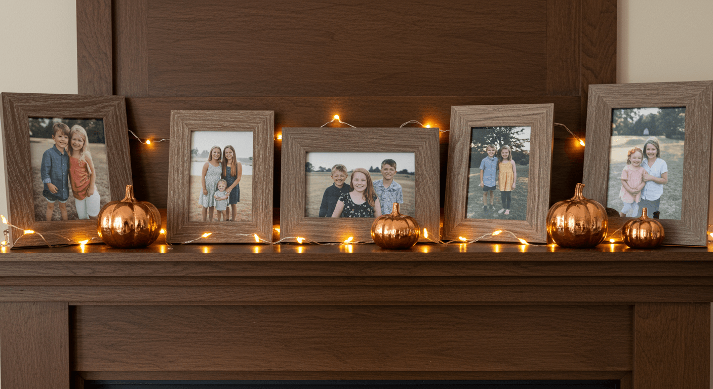 Picture a mantle where family photos of apple-picking trips, kids in Halloween costumes, and Thanksgiving gatherings sit in rustic wooden frames. Between the photos are tiny copper pumpkins and a string of fairy lights weaving through, glowing against the glass. The mantle feels like a scrapbook brought to life.