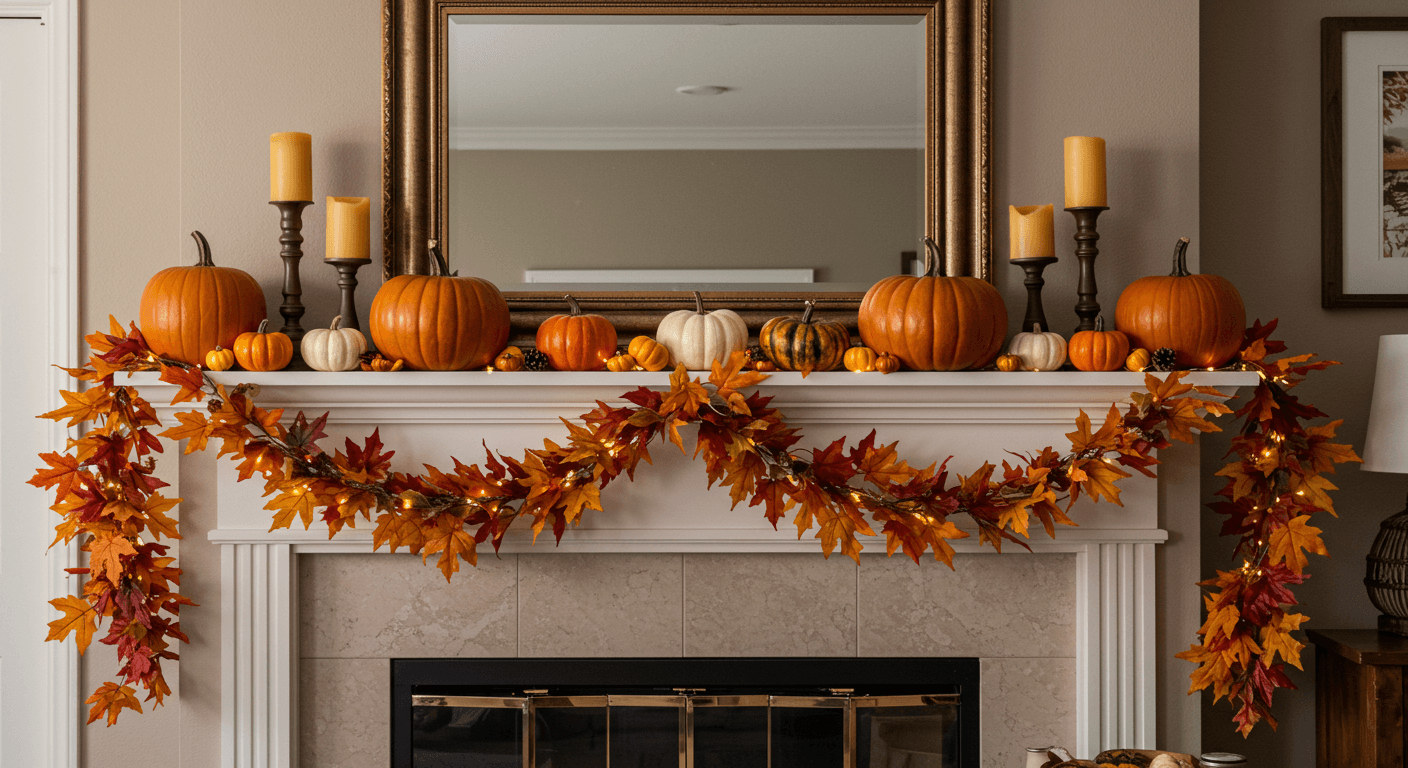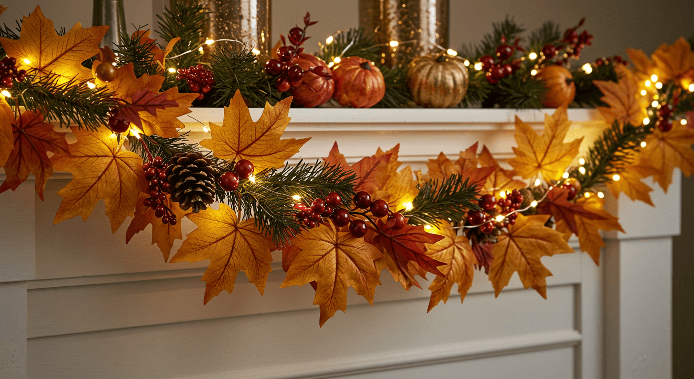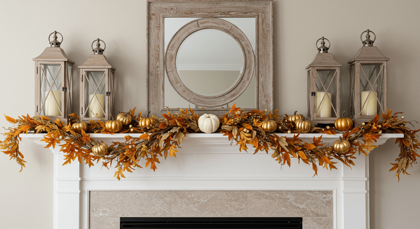 Nothing frames a mantle like a garland, and in fall, you can really play with texture and light. A golden autumn garland instantly turns your mantle into a glowing statement piece.