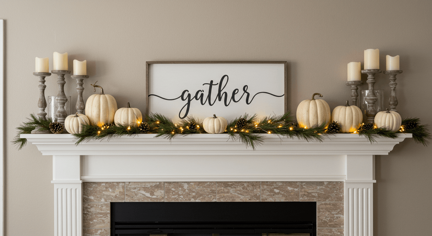Picture soft cream pumpkins lined across the mantle, interspersed with pine sprigs and twinkling fairy lights. In the center sits a rustic wooden sign reading Gather. After Thanksgiving, you can simply swap the sign for Joy or add a few ornaments—and the look seamlessly shifts into winter.