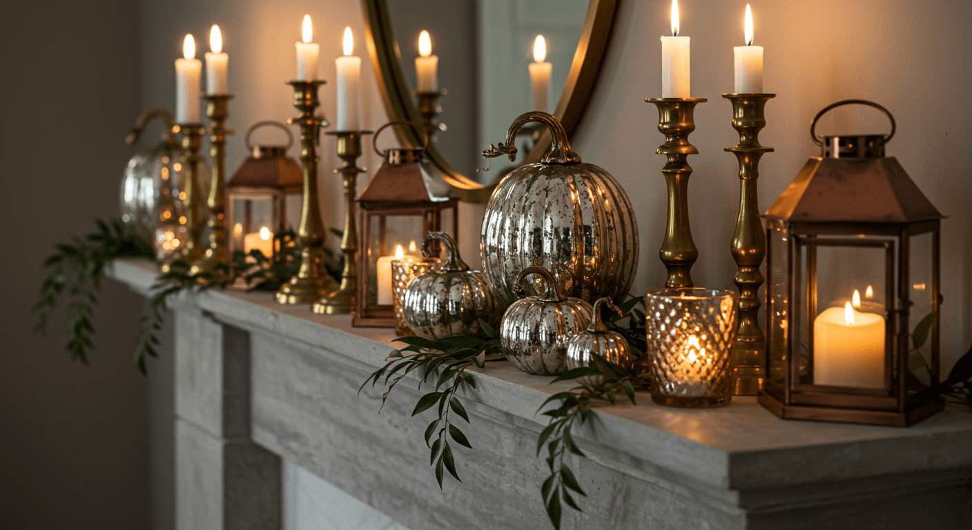 If you want your mantle to whisper sophistication while still celebrating fall, metallic accents are your best friend. Think of gold, brass, and copper as the autumn sun captured in décor form. When paired with candlelight, they create an atmosphere that feels both warm and luxurious.