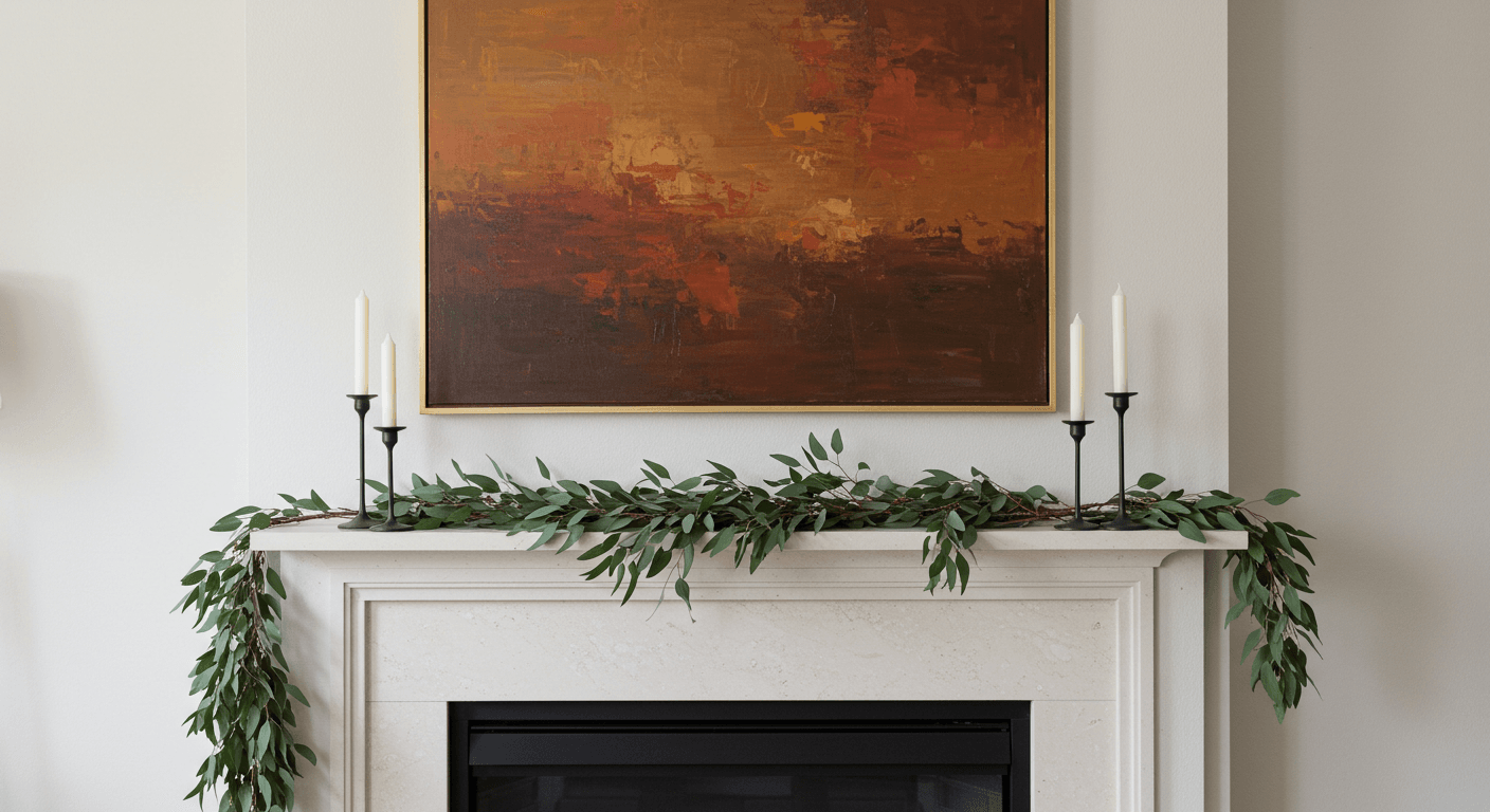 Imagine a sleek white mantle with a long eucalyptus garland running across, accented by just two ivory candles on the ends. Above hangs a bold, modern art piece with strokes of ochre, sienna, and soft gray. The result is calm, balanced, and Instagram-ready.