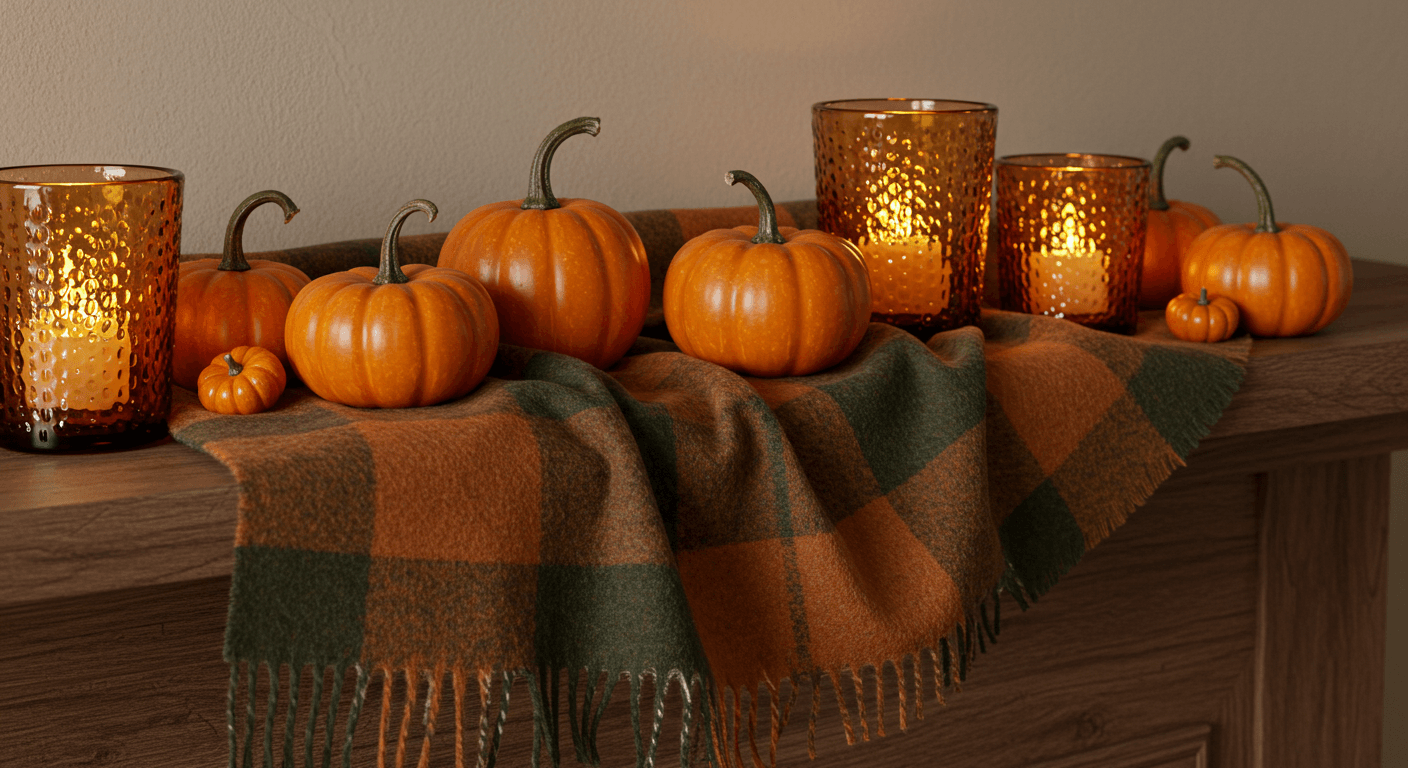 Imagine a soft, tartan scarf in burnt orange and hunter green draped across a white mantle. On top, amber glass bottles hold single stems of wheat, while a cluster of small pumpkins rests playfully in one corner. The look feels warm and effortless—like you just wrapped the mantle in your favorite fall outfit.