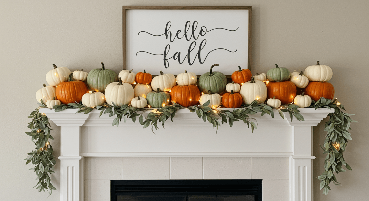 Imagine a soft cream-and-caramel color palette with white pumpkins dominating the mantle, accented by pops of sage green and burnt orange. A rustic wooden “Hello Fall” sign anchors the center, while fairy lights peek out between pumpkin stems, glowing softly as evening falls.