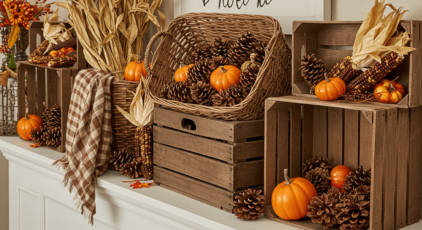 Picture a plaid blanket in warm reds and browns peeking out of a wicker basket. Nestled inside are pinecones, dried corn stalks tied with twine, and a handful of cream-colored pumpkins. The mantle feels like it’s straight out of a countryside harvest festival.