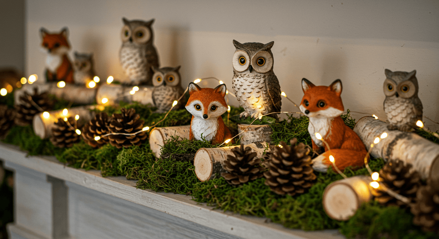 Imagine a mantle transformed into a miniature forest scene. A pair of ceramic owls perch among moss, a wooden fox figurine peeks out from behind pumpkins, and birch logs lean casually on one side. Warm twinkle lights woven through the moss give the entire mantle an enchanted glow.