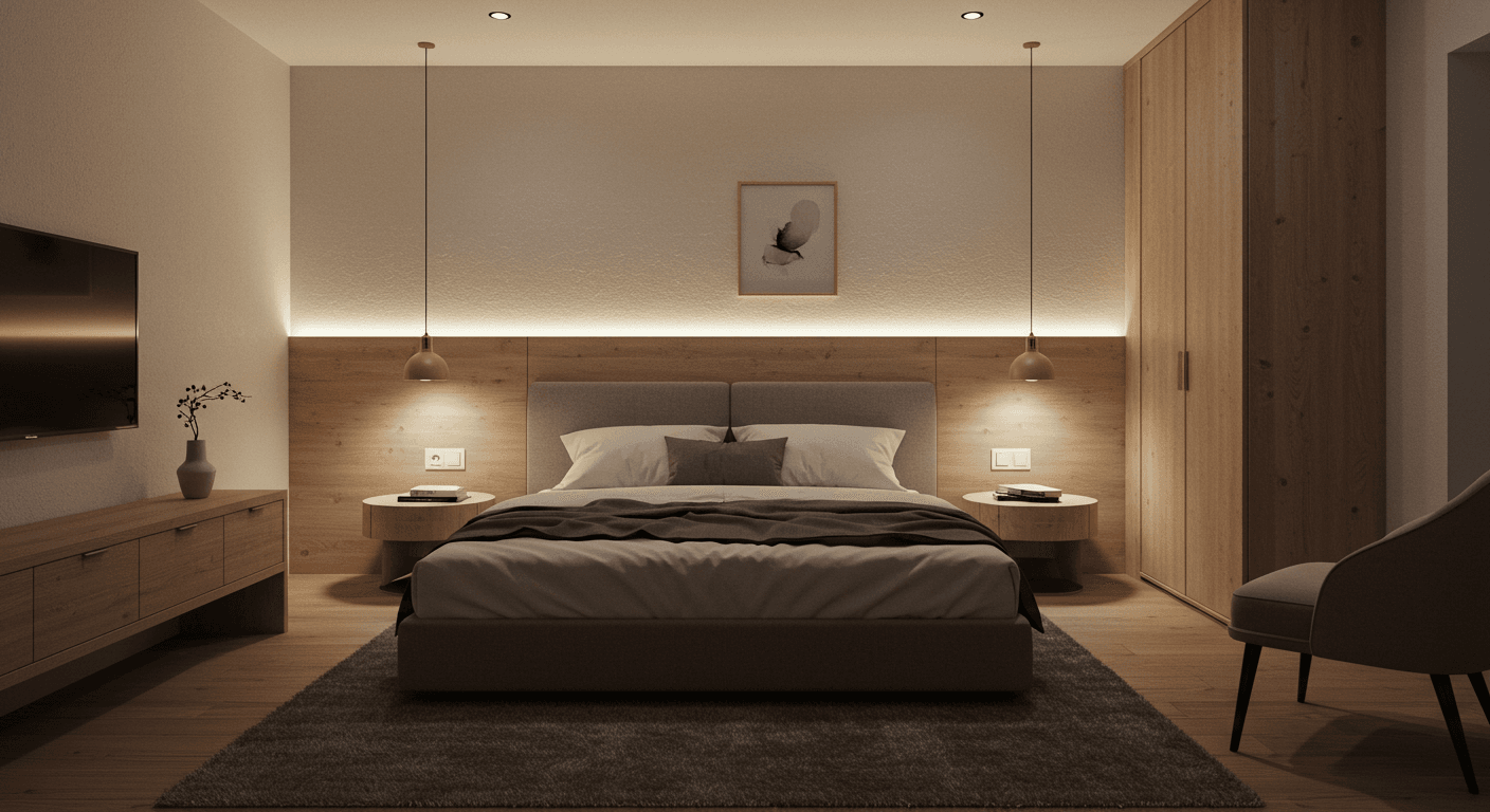 Instead of one bright overhead light, multiple sources work together. Pendant lamps or wall-mounted sconces replace bulky table lamps, freeing up surfaces. LED strips behind a headboard or under a bed frame add subtle ambient glow.