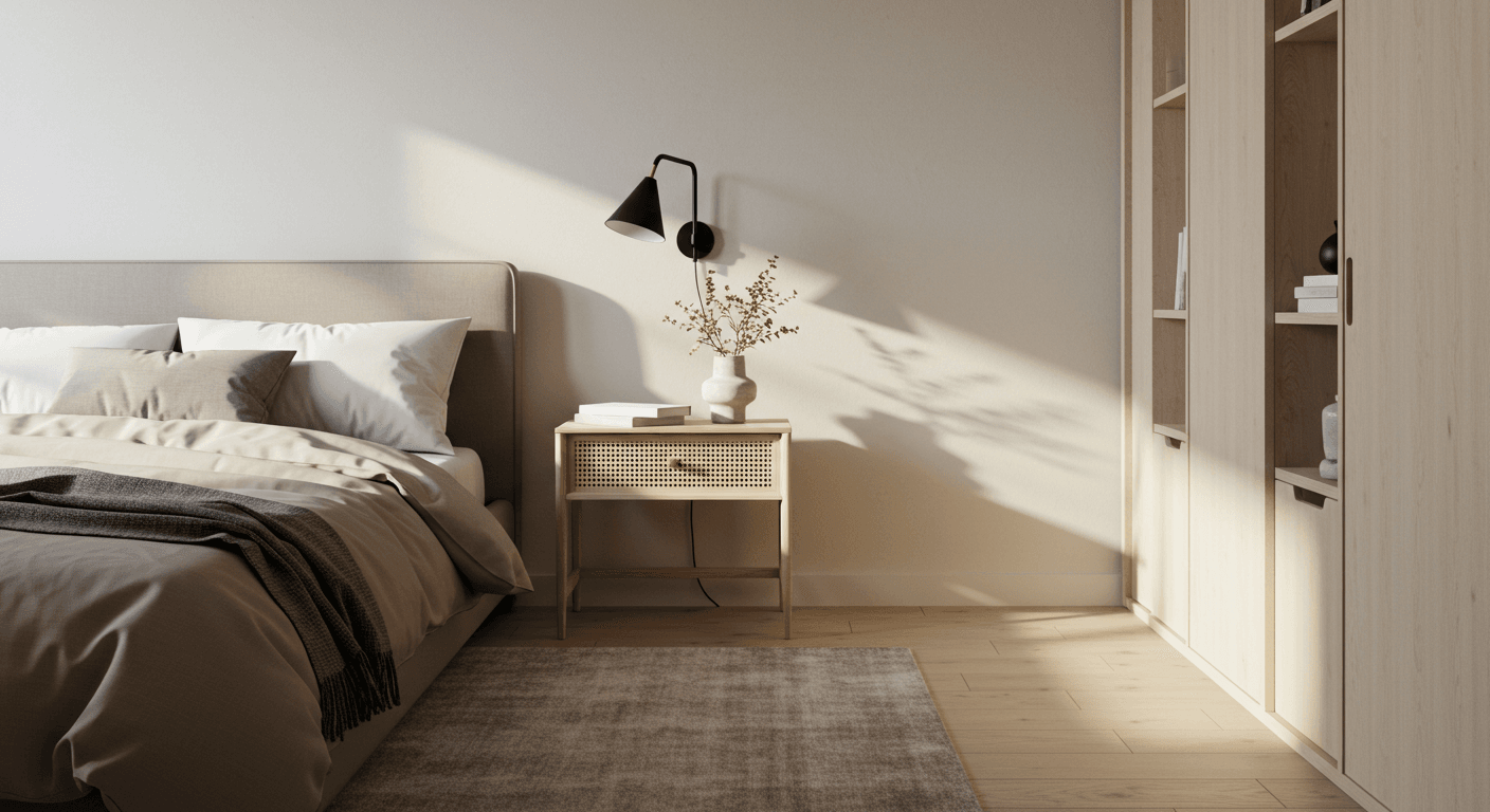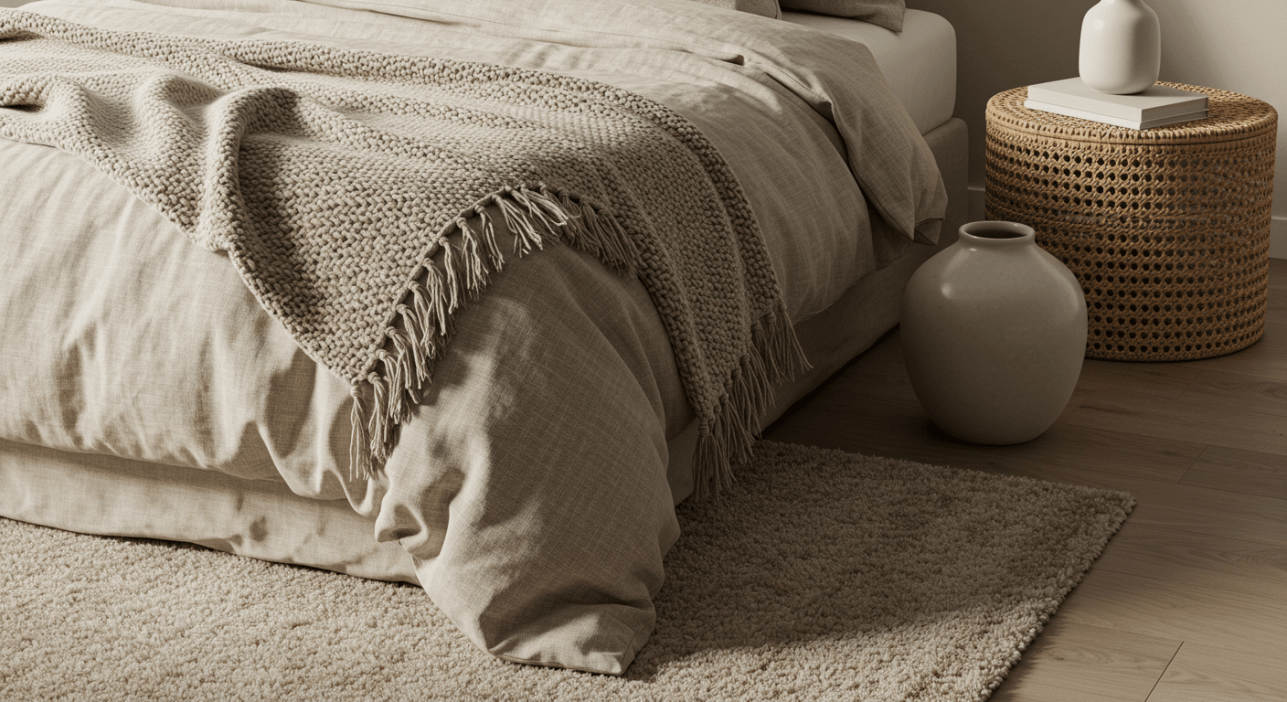 Think linen bedding layered with a knitted throw, a soft wool rug underfoot, light oak furniture paired with matte ceramics on a nightstand. Even a rattan basket or a single woven wall hanging can introduce depth without adding clutter.