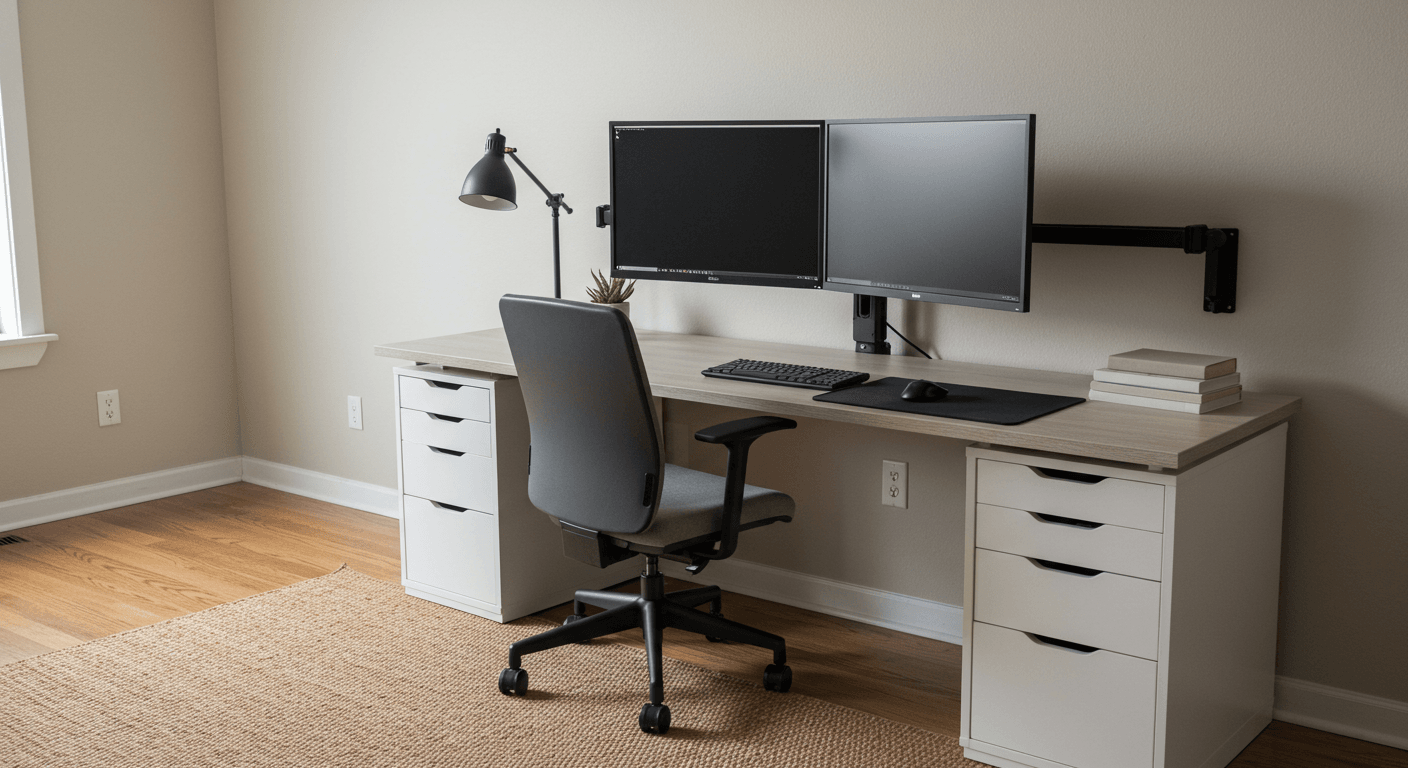 Use cable management systems to keep wires out of sight. Opt for wireless devices where possible: keyboards, mice, and printers that reduce visual noise. A dual-monitor setup can still be minimalist if the screens are mounted cleanly and cables hidden.