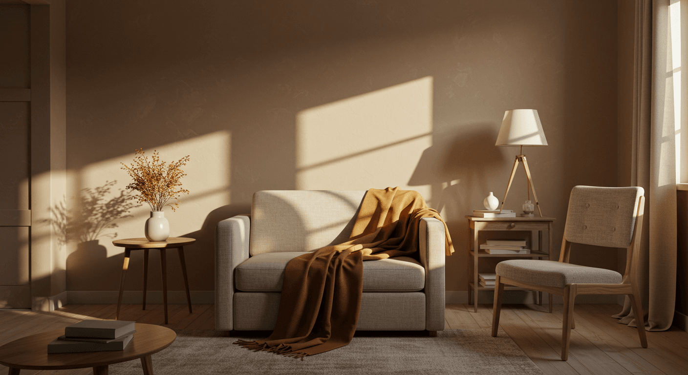 Image AI Prompt: A photorealistic interior shot of a cozy, elegant living room with north-facing light. The walls are painted a soft, warm beige. A plush caramel-colored throw blanket is draped over a neutral sofa. Soft, diffused light creates a serene and inviting atmosphere. Minimalist decor with light-colored wood furniture.