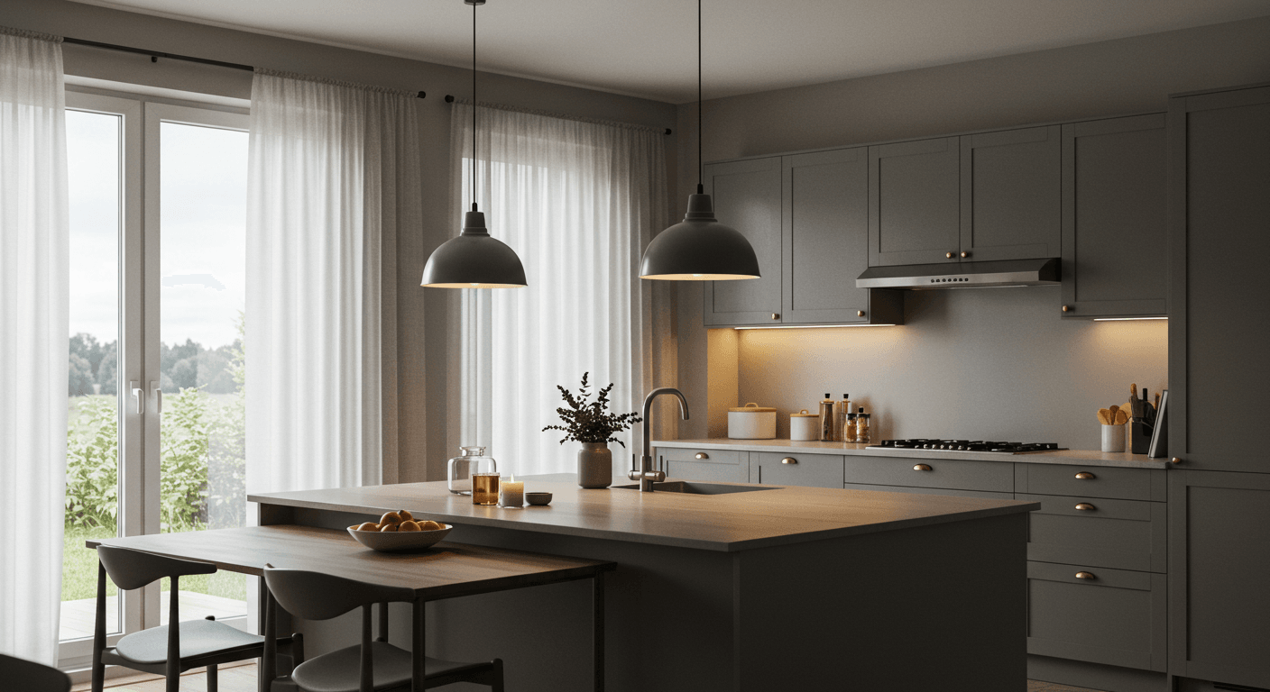 Artificial lighting is layered to complement natural light. Pendant lamps above the island provide task lighting, while under-cabinet strips illuminate work surfaces. In dining nooks, warm wall sconces create a cozy atmosphere for evening meals.