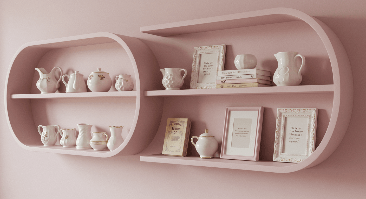 Curved-edged wall shelves create a romantic, elegant display. Floating shelves painted in pastels or distressed white hold ceramics, books, or framed quotes. Mix sizes and heights, decorate with lace-edged boxes or seasonal items, and illuminate with soft lighting. Secure mounting ensures stability. Personal touches like photos or mini floral arrangements enhance charm. Curved shelves offer a stylish, curated way to showcase feminine decor.